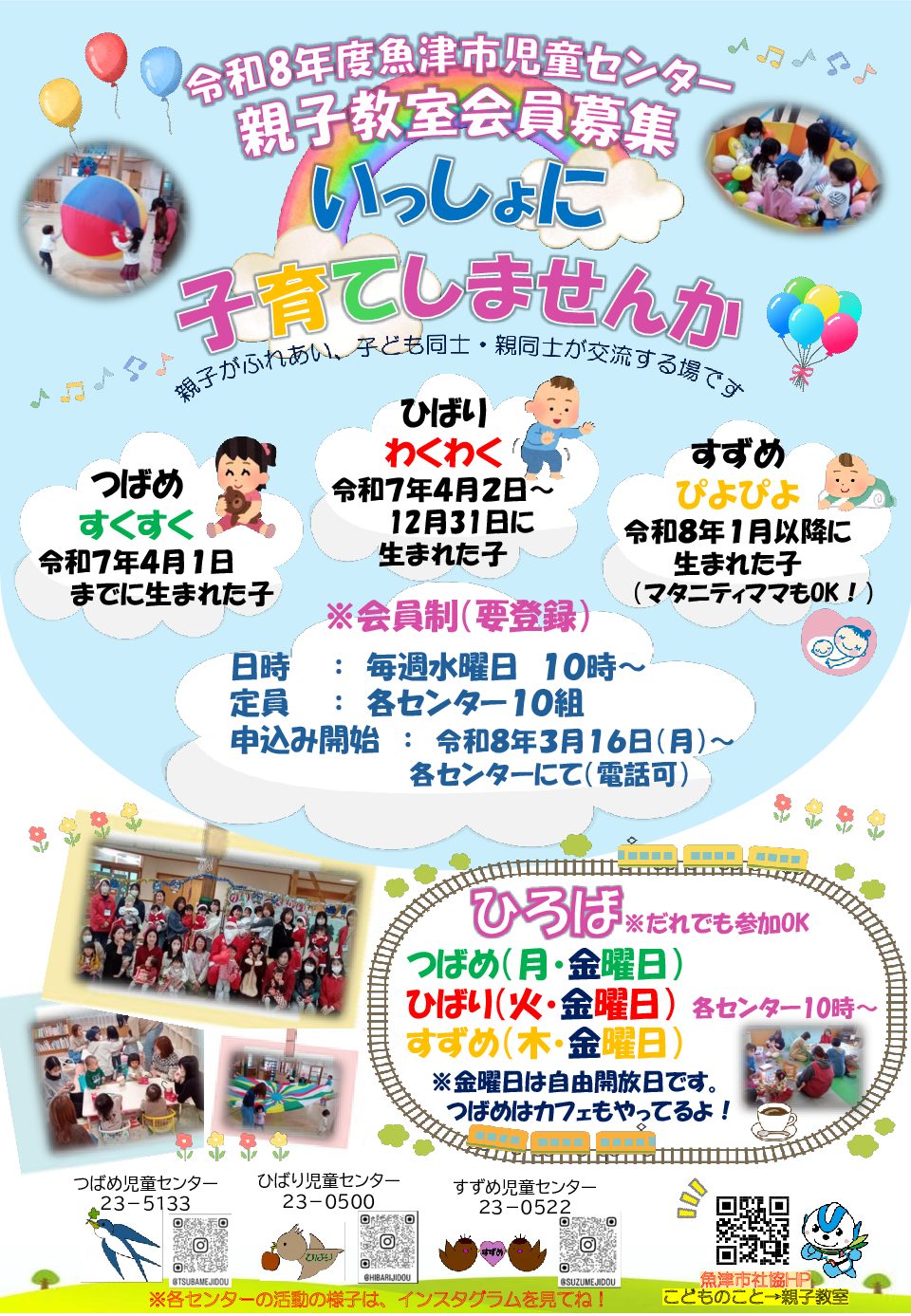 魚津市内3館の児童センター(つばめ・ひばり・すずめ)では、令和8年度の親子教室会員を募集しています。